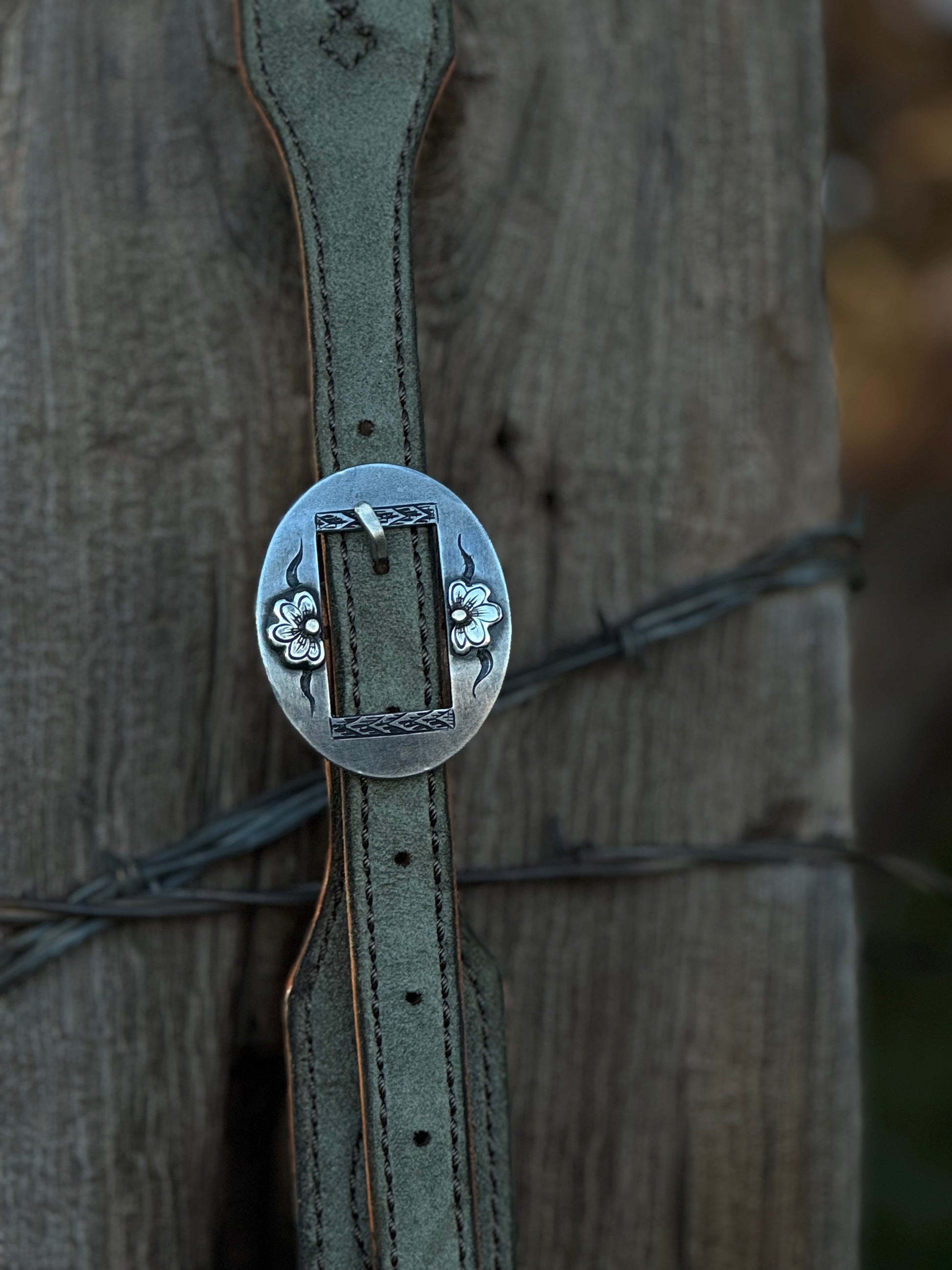 Handmade roughout split ear headstalls lined with harness leather and decorative stitching with steel and silver buckles